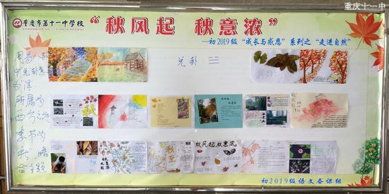 此次中秋作业是初2019级语文备课组“成长与感恩”系列之“走进自然”,以“秋风起,秋意浓”为主题,要求学生用图配文的形式来展现,其目的是为了让学生“亲近自然,走进自然” ,在自然中学会观察、学会感悟,看到生命的成长。学生对这样的作业很感兴趣,积极参与,作业质量很高,初一(1)班的学生这样评价这次作业:这样的作业有趣、好玩,特别是能在玩当中又学到知识,真正地做到了寓教于乐。最后在年级备课组活动中老师们提出筛选一部分优秀作品展示出来,藉此激励学生,促使共同进步。
