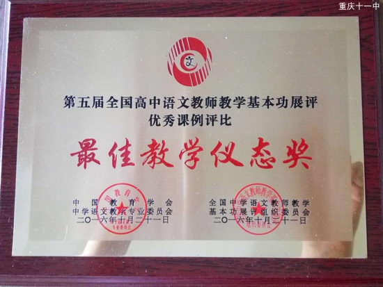 展评会上,张俊老师不仅用深情与思想演绎了《合欢树》的课堂设计,更对我校语文“大阅读”课程进行了介绍和推广,其超强的基本功赢得了专家的高度肯定。在语文课堂上主张“多读书,读好书”,“做感情温暖的人,做精神明亮的人”,主张像史铁生先生一样“在无常的世间深情地生活”,做一个真正的英雄主义者,更是赢得了现场老师的深切认同。张老师凭借她的优秀表现,参赛视频荣获“第五届全国高中语文教师基本功大赛优秀课例一等奖”,同时还获得了“最佳教学仪态奖”的殊荣!为我们重庆十一中在全国语文专家及兄弟学校面前作了一个精彩亮相!