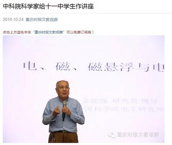今日上午,中国科学院电工研究所金能强教授来到重庆十一中,为该校千余名师生作了一场“电、电磁、磁悬浮与电磁武器”的讲座。