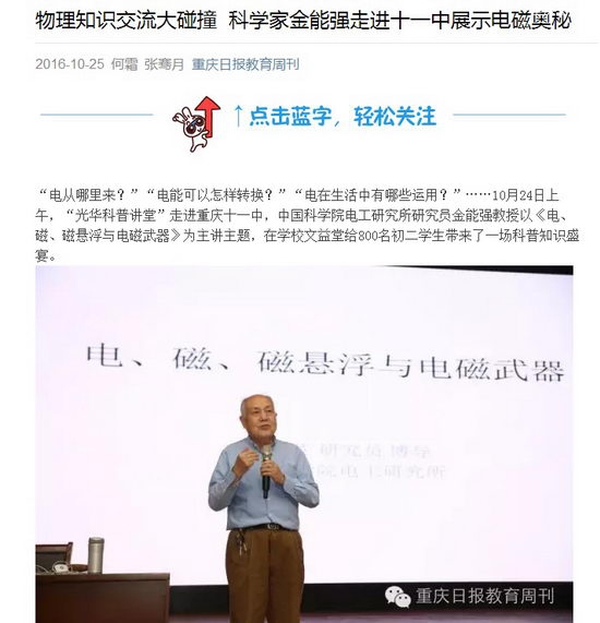 “电从哪里来?”“电能可以怎样转换?”“电在生活中有哪些运用?”……10月24日上午,“光华科普讲堂”走进重庆十一中,中国科学院电工研究所研究员金能强教授以《电、磁、磁悬浮与电磁武器》为主讲主题,在学校文益堂给800名初二学生带来了一场科普知识盛宴。