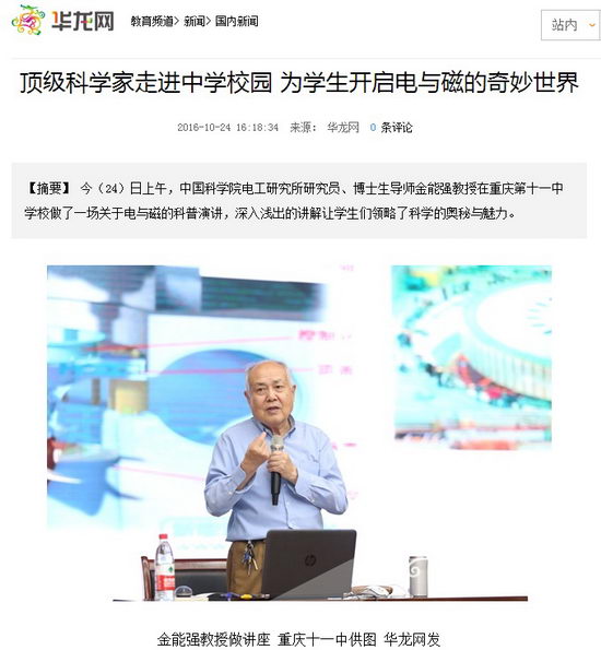 华龙网10月24日16时13分讯(王静)电是什么?电从哪里来?电与磁在生活中有哪些应用?带着这一连串的问题,重庆十一中的学生们开启了一场奇妙的科学之旅。今(24)日上午,中国科学院电工研究所研究员、博士生导师金能强教授在重庆第十一中学校做了一场关于电与磁的科普演讲,深入浅出的讲解让学生们领略了科学的奥秘与魅力。