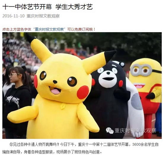 你见过各种卡通人物齐跳舞吗?今日下午,重庆十一中第十二届体艺节开幕,3600余名学生自编自演自导,身着各种造型服装,现场展示了班级特色与创意。