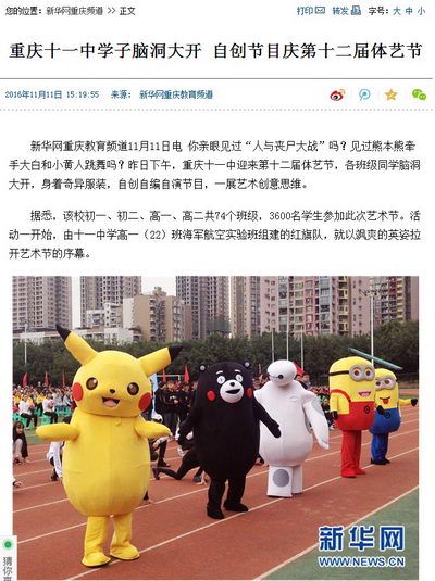 新华网重庆教育频道11月11日电你亲眼见过“人与丧尸大战”吗?见过熊本熊牵手大白和小黄人跳舞吗?昨日下午,重庆十一中迎来第十二届体艺节,各班级同学脑洞大开,身着奇异服装,自创自编自演节目,一展艺术创意思维。