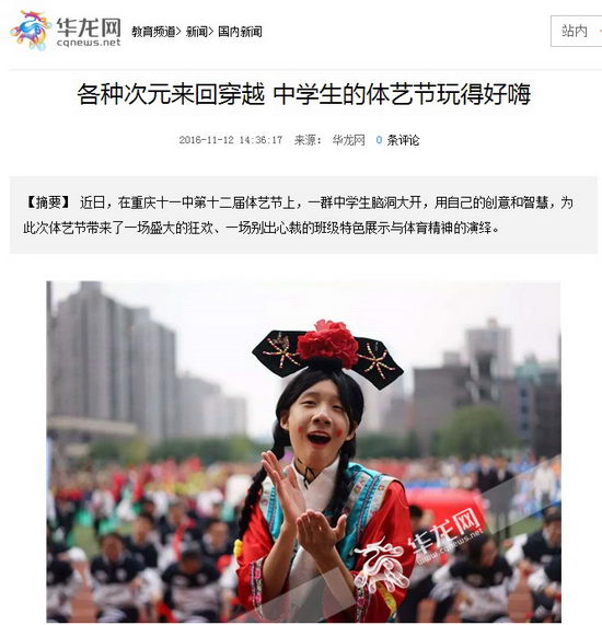 【摘要】 近日,在重庆十一中第十二届体艺节上,一群中学生脑洞大开,用自己的创意和智慧,为此次体艺节带来了一场盛大的狂欢、一场别出心裁的班级特色展示与体育精神的演绎。