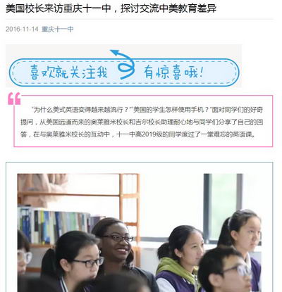 2016年11月14日,来自美国波姆庞帕诺滩高中的奥莱雅米校长和来自南布劳沃德的校长助理吉尔带着扩大合作、深化友谊的意愿来到了重庆十一中,作为美国高校的代表,与重庆市第十一中学校进行了深刻的交流和探讨。