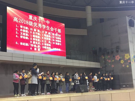 最后进行的是“重庆十一中高2018级高二学年12月月考”表彰,各班进步标兵、各班状元、理科前十名、文科前五名、直升班前五名优秀学生上台领奖。