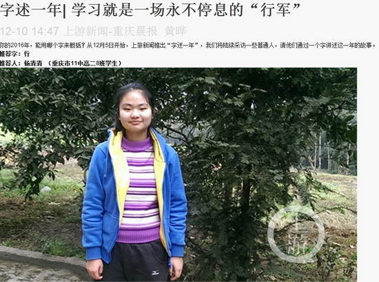 你的2016年,能用哪个字来概括?从12月5日开始,上游新闻推出“字述一年”,我们将陆续采访一些普通人,请他们通过一个字讲述这一年的故事。