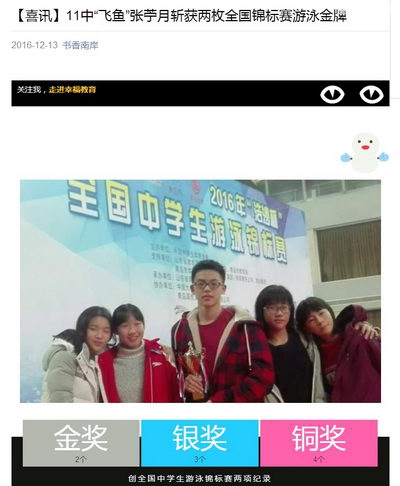 据悉,2016全国中学生游泳锦标赛在山东青岛举行,来自全国54个代表队参加本次比赛,经过两天的角逐,11中张苧月分别获初中女子200米、400米自由泳冠军,且创全国中学生游泳锦标赛两项纪录;李兰心获2枚银牌;梅林江获1枚银牌;陈开愚获2枚铜牌;周婷婷获1枚铜牌;尹舜民获1枚铜牌。初中女子组获4×100米自由泳接力第3名,获4×100米混合泳接力第3名;高中男子获4×100米混合泳接力第7名,获4×100米自由泳接力第8名;初中女子组获团体总分第二名。