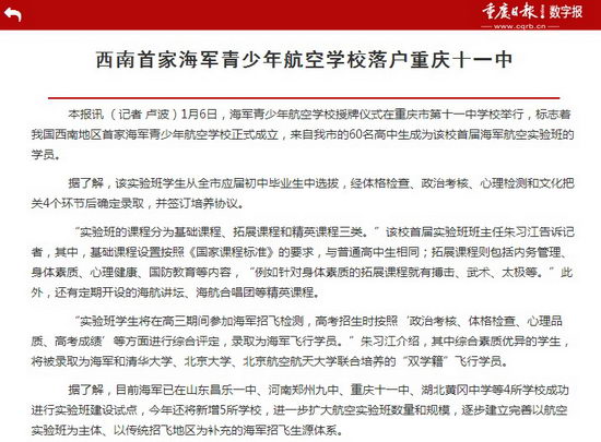 [重庆日报] 西南首家海军青少年航空学校落户重庆十一中