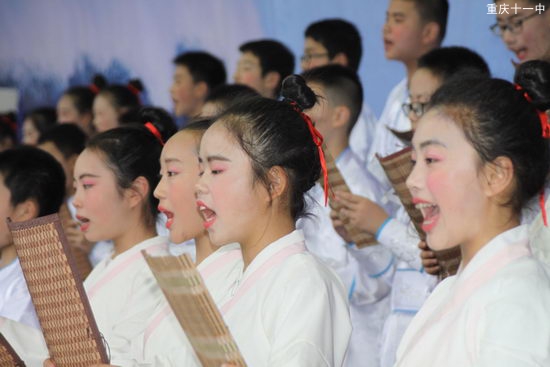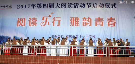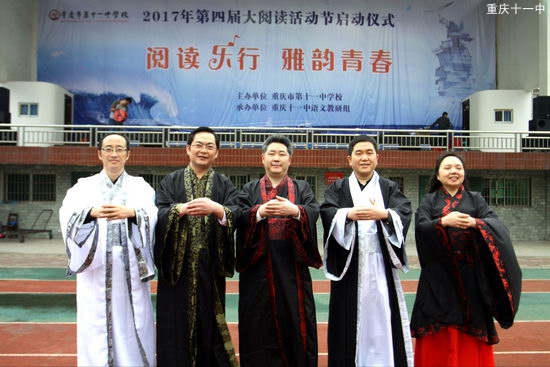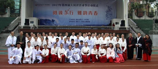 钟进友校长为本次大阅读活动致辞,强调了大阅读活动的意义。接着,在李校长、钟校长、高2018级语文教师张盈、欧校长、杨主席、钟书记的带领下,分年级分别诵读了《离骚》、《观沧海》、《春江花月夜》等诗词,随后各学科的代表教师都身着古装、充满激情分别诵读古诗词,使全校师生都享受这古文化的洗礼。最后,在全校学生齐诵《正气歌》雄浑的气势中,本次活动的启动仪式落下了帷幕。