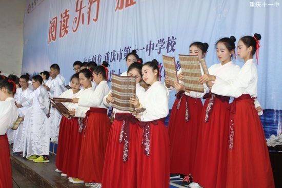 活动伊始,初一学生身着汉服为大家唱诵《声韵启蒙》,一句句稍显稚嫩的语言,传颂出阅读的魅力。