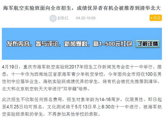 4月19日,重庆市海军航空实验班2017年招生工作新闻发布会在十一中举行。据悉,十一中作为西南地区首家海军青少年航空学校,今年面向全市招收100名男性初中应届毕业生。海航实验班成绩优异的学生,将有机会被优先推荐到清华、北大和北京航空航天大学进行“双学籍”培养。