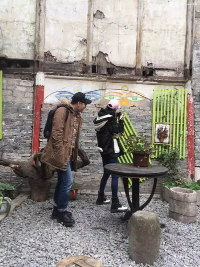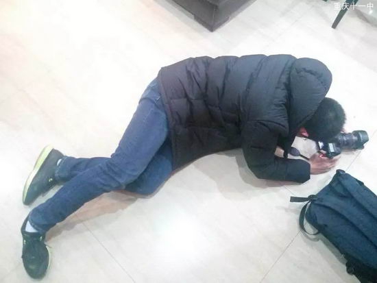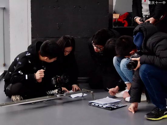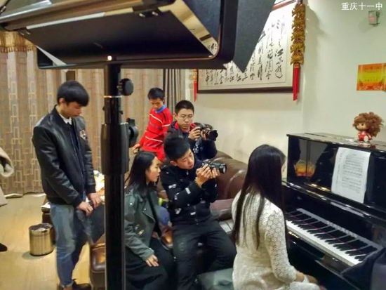 拍摄取景(左二为我校学生李海伦,右边三个为巴蜀、育才的摄影社和戏剧社成员)