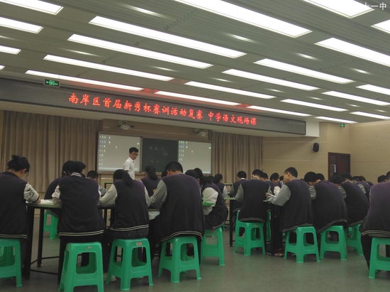 同时,南岸区首届新秀杯赛训活动复赛——中学语文现场课在修德楼多媒体室(一)举行,上午第二节课,语文组全体老师到场观摩学习。本次课是对《燕歌行》一诗进行解读,授课老师通过对诗句中存在的一场场“黑幕”进行剖析,以“悲”和“壮”两个字逐步完成对本诗主题的解读。老师侃侃而谈,学生各抒己见,师生共同呈现了一堂精彩的语文课。最后,师生齐诵食指的《相信未来》一诗,本堂课也在这慷慨激昂的诵读声中落下帷幕。