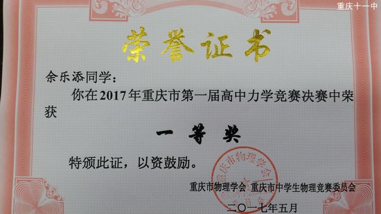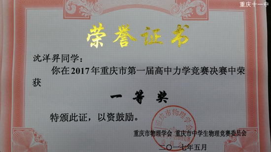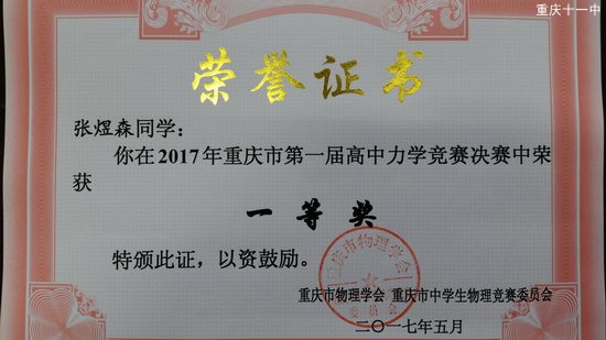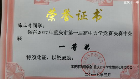 重庆市第一届高中力学竞赛决赛于2017年5月21日在重庆一中完满落幕,来自全市530名高一学生报名参赛,重庆市物理学会、重庆市中学生物理竞赛委员会根据决赛成绩评出了一二三等奖,我校共28人参赛,高一张煜森、沈洋弈、余乐添、陈正奇四位同学获得一等奖,另外有16人获得二等奖、6人获得三等奖。
