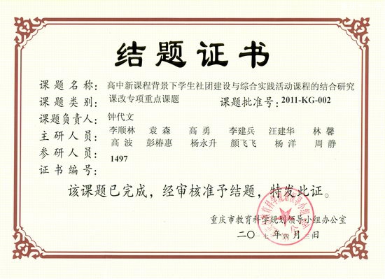 经重庆教育科学规划办的领导和有关专家团队评审,批准我校承担的重庆市课改专项重点课题“高中新课程背景下学生社团建设和综合实践活动课程的结合研究”结题。特此对课题组取得的成果的表示祝贺,也对指导课题研究的专家团队表示真诚的感谢!