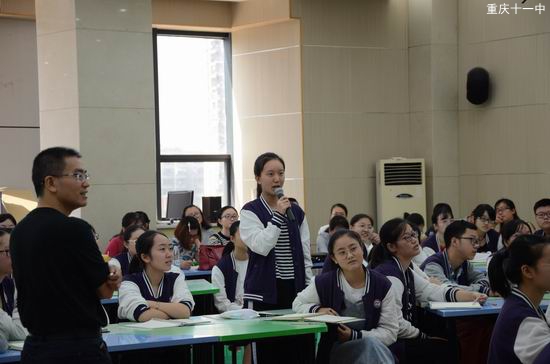 “作文的表达力度”课上,周鹏老师首先提出有力的表达应该“有话不直说,换个说法说”,然后以“时代缺乏一种高贵的精神”这句话的扩展为例,指导学生用引进新元素,利用类推、对比、因果或意象等方式使表达明白清楚、有力动人。课堂上周老师步步深入,学生们积极思考,回答踊跃。