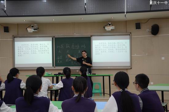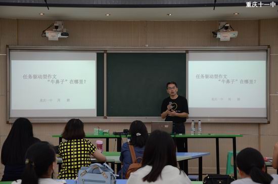 2017年9月12日,我校在多功能教室举办了语文教学交流研讨活动。西南大学文学院特聘教授、重庆市骨干教师周鹏莅临我校,与我校语文组的老师们进行了深入的交流。