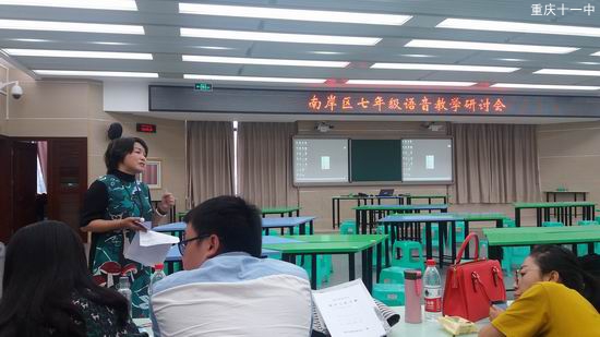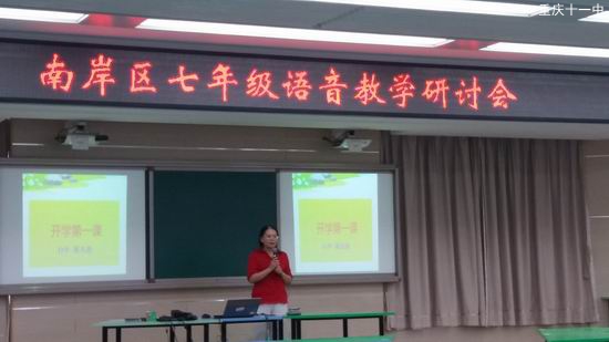 9月21号上午,南岸区七年级语音教学研讨会在我校修德楼四楼多媒体1教室如期举行。首先是南岸区英语教研员薛老师对11中初中各年级英语备课组积极申报举办区级教研活动提出了高度赞扬。接着,周凡奇老师就自己研究了三十几年的开学第一课与全区老师进行了介绍和分享,周老师的开学第一课中,首先是通过图片让学生了解自己的生活,并用自己积极进取的生活态度影响带动学生。接着是让孩子们分享自己假期的作业,反思假期的学习效果。然后是通过妙趣横生的故事,英语谚语等孩子们非常感兴趣的方式给孩子们提出希望,并且告诉孩子们英语学科学习的具体要求及需要准备的学习用品。最后老师与学生能达成共识,形成合力,达到思考、表达、共识、提升的效果。