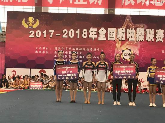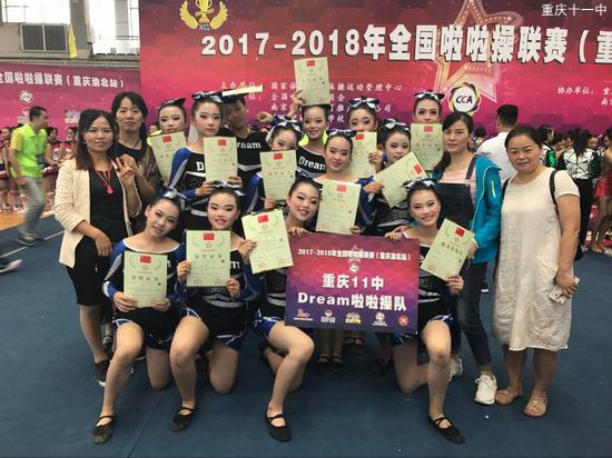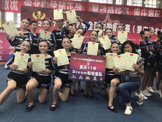 圆梦时刻:我们的泪水、汗水换得了“全国啦啦操联赛重庆渝北站乙组花球规定动作第二名”的优异成绩!
