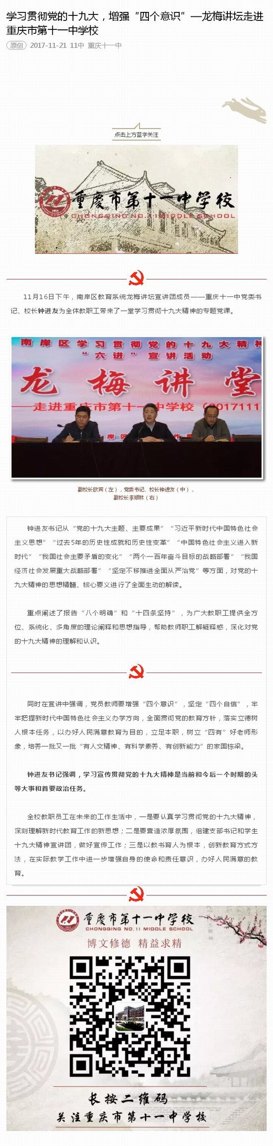 [重庆11中官方微信]学习贯彻党的十九大,增强“四个意识”—龙梅讲坛走进重庆市第十一中学校