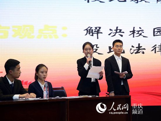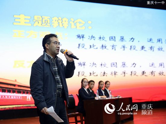 重庆十一中的8名学子围绕“解决校园暴力,运用法律手段还是教育手段更有效”这一议题,展开辩论