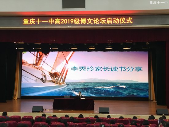 重庆市文联的著名作家高铭讲述了自己的一生,诠释了美好的青春。高2019级4班李皓男、6班的饶璟玥等同学,西南大学实习老师李玉以及家长李秀玲分别用读书分享的方式告诉同学们青春是不负芳华不负卿,最后同学们一起唱《最美的太阳》,激情高昂的表达在青春路上的逐梦。