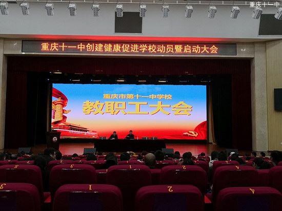 2018年3月5日,重庆市第十一中学校召开了创建健康促进学校的全体教师动员大会。会上,钟进友校长传达了重庆市南岸区教委“关于做好健康促进区创建相关工作的通知”相关文件精神,代表学校宣读了创建健康促进学校的动员书及创建工作实施方案,号召全体教师积极投身到学校的健康促进创建工作中来。学校要求全体教师利用课堂阵地,发挥学校小手拉大手的优势,通过教育好每一个孩子,来促进更多的家庭积极投身于创建健康促进示范区的工作中来。