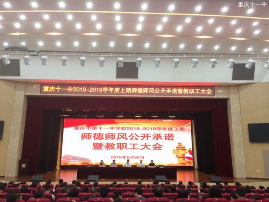 为深入学习宣传贯彻党的十九大精神、习近平新时代中国特色社会主义思想,进一步加强教师职业道德建设,全面提升重庆十一中教师队伍素质,2018年8月28日,我校在文益堂举行了2018-2019学年度上期师德师风公开承诺暨教职工大会。本次大会共分为两个议程:一是师德师风宣誓及承诺书签约,二是校党委书记、校长钟进友上“强化纪律要求,争当四有好老师”的党课。