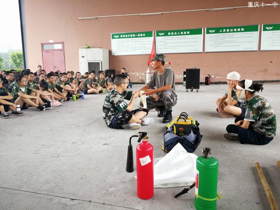 为了提高同学们的消防意识,提升在紧急情况下的应变能力与自我防护能力,教官们分批给同学们讲解有关消防知识,并演示了消防器材的使用方法,为了让同学们有更深刻的认识,还请同学们一起来参与了野外紧急包扎的示范活动。这些刚进入高中的孩子们面对“伤员”有条不紊,熟练完成了头顶帽式包扎、上肢三角巾包扎和双胸包扎,举手投足间英姿飒爽的气质浑然天成。