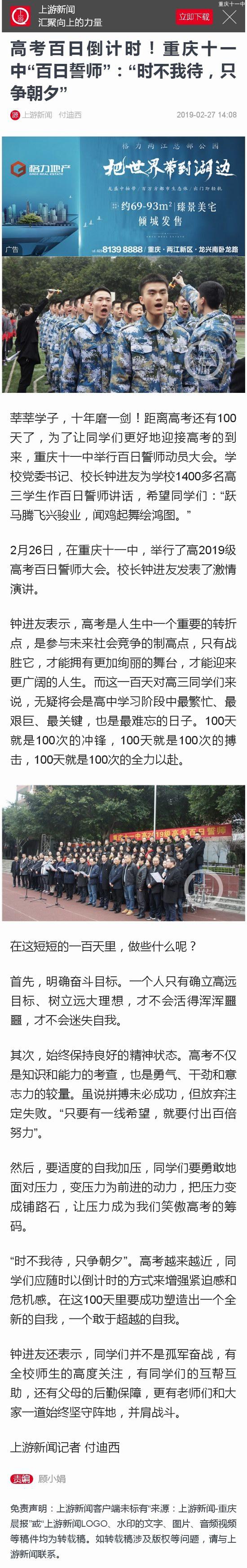 【上游新闻】高考百日倒计时!重庆十一中“百日誓师”:“时不我待,只争朝夕”
