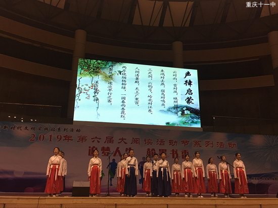 这次大阅读活动以另外一种风格将中华文化演绎地淋漓尽致——演唱、说唱、情景剧……初一初二的“演员”们将看似与现代文化不太有相似度的中华文化交织在一起,以新颖的形式传递中华文化最根本的精髓所在,这正是青少年在碎片化信息风靡的时代下的文化追求。有人曾问过:“随着时代发展,古诗之类的文化是否会落魄?”然而十一学子在大阅读活动上用精彩纷呈的表演、以铿锵有力声音回答:“中华文化永不朽!”