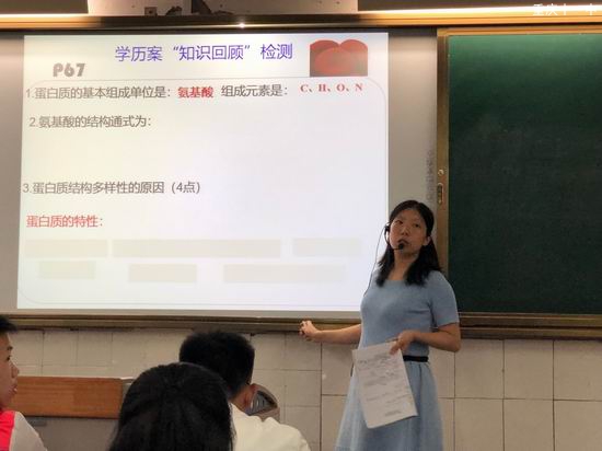第二节课孕妈任秋露老师以《血红蛋白的提取和分离》这节课,带领高二(5)班学生学习,她首先让学生用学历案进行了预习,基于蛋白质的功能推测出作为蛋白质的特性,又根据蛋白质的特性,提出分离蛋白质的方法,第一个方法就是凝胶色谱法,从实验材料到实验原理让学生们不断巩固,接着同时学历案的方法一总结让学生强化,并通过为社么凝胶需要装得十分紧密,分离效果是否与高度有关,直径是否影响分离效果三个问题不断让学生的思维拓展,强化对实验方法的理解分析,对知识重点难点的逐一突破,第二个方法是电泳法,同样通过学历案进行预习之后,任老师通过游泳池对比电泳槽、泳道对比凝胶、缓冲液对比水将抽象知识具象化,让学生能够快速掌握,最后也是通过学历案进行了总结,让学生加强蛋白质的特性对分离效果的影响。任老师的图像转化能力和对每个知识点的小结设计让老师们眼前一亮赞叹不已。