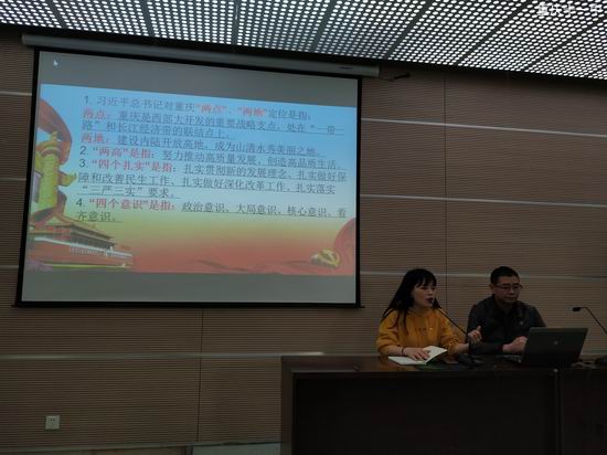 党员大会共持续四十五分钟,在党组长余飞扬老师的带领下主要学习了以下知识: 习近平总书记对重庆“两点”、“两地”定位;“两高” “四个扎实”、“四个意识”、“四个自信”、“两个维护”、“三个确保”、“三大攻坚战” “八项行动计划” 、 三个“必须”的含义和要点。余老师在讲解的过程中,用幽默风趣的语言,图文并茂的方式,让每位党员彻底的理解每个政策的含义以及目的,也更加认同自己党员的身份,为身为一名中国共产党党员而自豪。