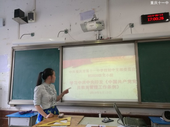 2019年6月13日下午第四节课(16:55分),中共重庆市第十一中学校初中支部委员会初2020级党小组全体党员在修德楼406教室召开党员大会,集中进行思想政治。会议的主要学习内容为:第一、学习《中国共产党党员教育管理工作条例》;第二、学习习近平总书记出席“不忘初心、牢记使命”主题教育工作会议的重要讲话精神;第三、观看任正非央视专访。