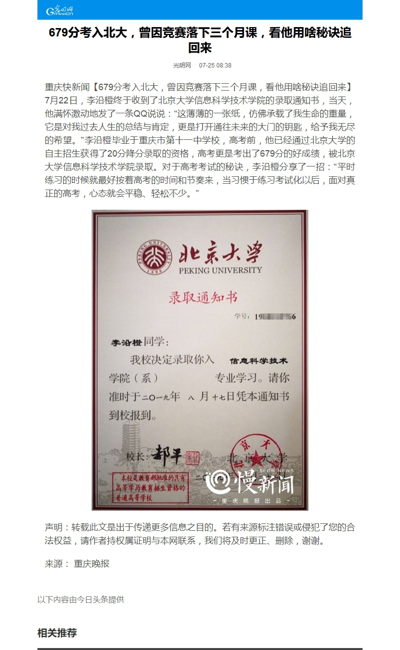 【重庆晚报】679分考入北大,曾因竞赛落下三个月课,看他用啥秘诀追回来