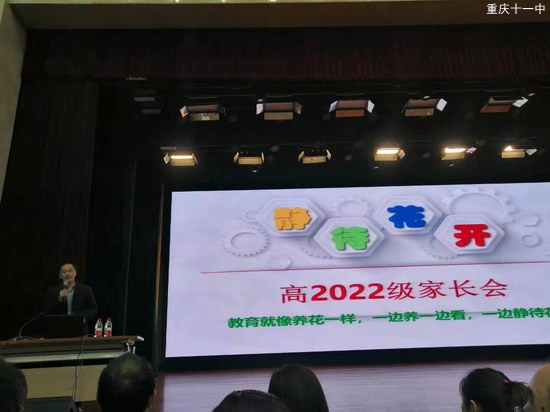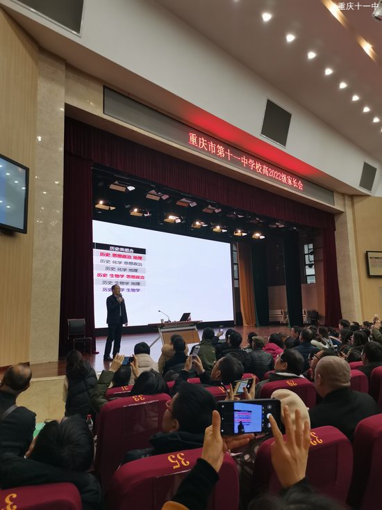 2019年11月30日下午三点在重庆市第十一中学文益堂召开了高2022级家长会。会议由年级主任高波主持,主要分为两个议程:一、钟进友书记结合新时代背景探讨“新高考背景下学校面临的挑战和对策”;二、李顺林副校长结合十一中特色讲解“新高考改革对学校和家庭的挑战和机遇”。