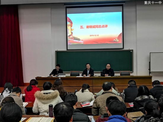 2019年12月12日晚上6点,中共重庆市第十一中学校高中第二支部委员会全体党员聚集在重庆十一中CBD校区报告厅,召开“不忘初心,牢记使命”主题教育专题组织生活会和民主评议党员大会,大会由高中第二党支部书记艾林同志主持,校党委委员、副校长谢晓斌同志参加会议。
