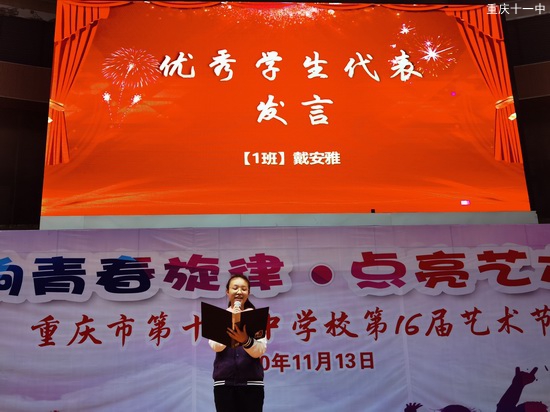 大会进行最后一项,优秀学生代表戴安雅同学进行发言。她是数理化三科均为年级第一、总分年级第一的优秀学生代表,对于青春与学习,她也有自己的认知与看法。戴安雅同学提出“担当”、“心态”与“勤奋”三个关键词,认为我青少年肩负“为国家栋梁,撑国家脊梁”的时代任务,需要用奋斗的甘霖润泽青春之花。在最美好的年华,心态平和、视学习为成长的利剑、视勤奋为护身盾牌,重视学习方法、为自己的未来负责。