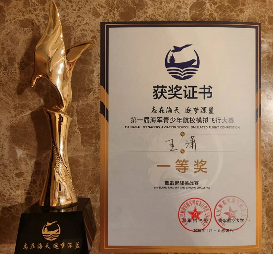 在Su-33舰载起降挑战赛中,我校选手王潇以1分43秒的好成绩排名第一,获得该项比赛的一等奖。
