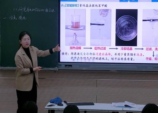 化学组党员教师廖林立授课内容为《研究有机化合物的一般方法》,她以屠呦呦研制青蒿素大大降低了疟疾患者的死亡率获得诺贝尔奖为导入,为老师们展示了精彩的教学过程。