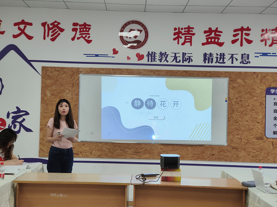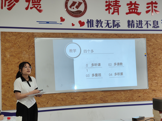 徐组长介绍完毕后,青年教师代表邹蝶老师和张梅老师的精彩分享,就是这种成效的集中体现。邹蝶老师分享了青年教师教学经验。邹老师作为顶岗教师,在工作岗位上兢兢业业、认认真真,所带班级成绩优良。她向与会老师们介绍了自己多听课、多积累等等教学日常以及案例,获得了一致好评。张梅老师接着分享了班级管理经验。张老师以细致、完善的各项制度治班,大到班级操行分评定,小到请假回寝室,都有相应制度加以管理。张老师班级运行顺畅,发展态势良好。