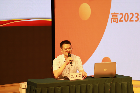 初三年级赖德东主任以“百十一文德从头跃,数三载青春勇攀登”为汇报主题,通过身边的“大数据背后的青春故事”,讲述本年级教师队伍戮力同心、克服了重重困难,取得了毕业年级的辉煌战绩。