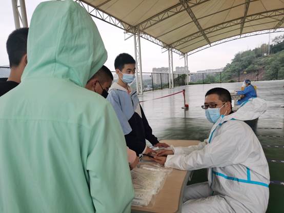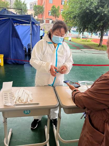 核酸采集现场,有一位学生的渝康码扫描不出来,急得团团转,江红老师主动安慰这位同学,让后面的同学先采集;赖德东同志主动联系这位同学的班主任,大家一起想办法,共同解决了这个问题,核酸采集工作得以顺利进行。