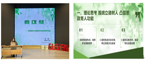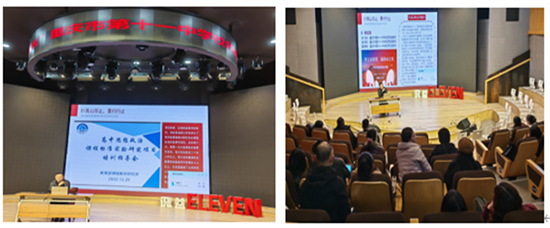 刘志荣名师工作室主持人刘志荣老师以“引领伴成长、凝心促提升”为主题,展示了工作室承办教育部课程标准实验研究项目、从思政课程到课程思政推动学科融合发展、二十大精神进课堂等工作成果,并结合自身经历谈到了从失败到成功的人生感悟,激励着大家勇敢进取的精神。