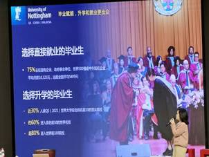 讲座尾声,宋婧琳老师介绍了宁波诺丁汉大学充沛的教育资源和优秀的国内外教授。宁波诺丁汉大学面向全球招聘优秀教师,其中一位外籍老师,因为对教育做出杰出贡献被英国女王授勋为爵士。宋老师还给大家讲述了本科招生志愿填报专业大类,中外联合办学分为“2+2”“4+0”两种路线,同学们可以选择在国内的宁波诺丁汉大学学习四年,也可以选择在大三的时候去英国诺丁汉大学继续学习。不同的专业决定了大家大三会在哪里继续深造,可见高考时填报专业是需要慎重考虑的。但是,在宁波诺丁汉大学的每一位同学都拥有重新选择专业的机会,不论是在大一还是在大二,做好决定后根据前一学期的成绩学校会帮助大家转专业。