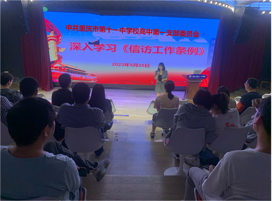 2023年5月25日下午五点,高中第一党支部全体党员在青年无界剧场开展了5月主题党日活动。活动内容为高中第一党支部书记余飞扬组织全体党员学习党章、党史,学习中共中央、国务院发布的《信访工作条例》,学习《学习贯彻习近平新时代中国特色社会主义思想主题教育工作会议在京召开 习近平发表重要讲话》,学习《习近平著作选读》(第一卷)《党旗在基层一线高高飘扬》等内容,并为5月入党同志过政治生日。