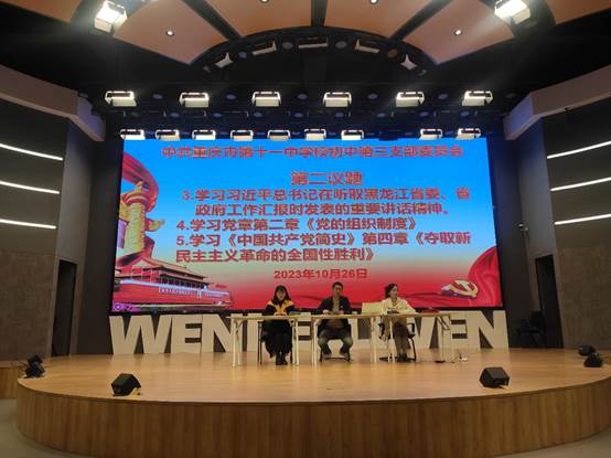 10月27日下午,初中第三党支部召开本月的主题党日活动,支部书记赖德东同志主持会议,支部党员“第一议题”学习了习近平总书记在中央政治局常委会会议审议第一批主题教育情况和第二批主题教育安排时发表的重要讲话精神、习近平总书记在黑龙江省哈尔滨市主持召开新时代推动东北全面振兴座谈会上发表的重要讲话精神、习近平总书记在听取黑龙江省委、省政府工作汇报时发表的重要讲话精神。