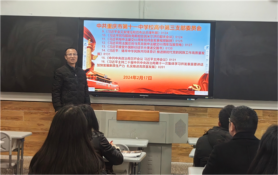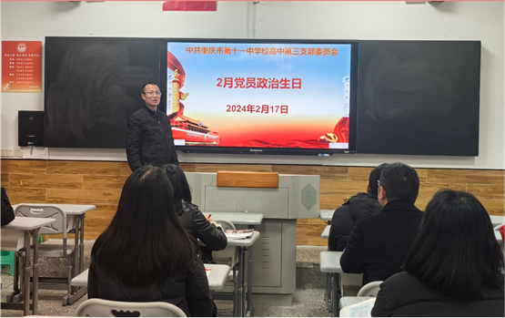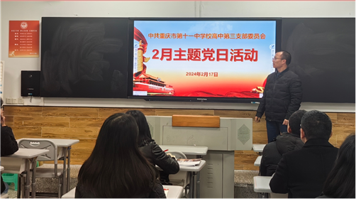 首先,新年新气象,新年新开端,赵明贤同志引导全体党员集中学习了重庆十一中党委规定的2月学习内容,赵明贤同志强调支部各位党员要切实巩固主题教育成果,号召引领全体党员以更加饱满的工作热情、昂扬的斗志投入到新的一年的工作中;全体党员教师要坚定文化自信,坚持守正创新,以社会主义核心价值观引领教育教学,更好地完成立德树人的根本任务。