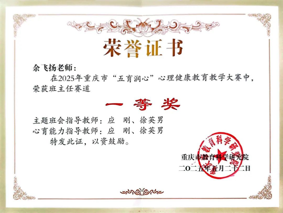 三尺讲台育芳华,一颗丹心铸师魂。余飞扬老师深耕班主任工作多年,始终坚守“让每个孩子成为最好的自己”的教育理念,关注学生心理健康,助力学生全面发展。此次获奖,不仅是余老师个人专业实力的精彩绽放,更是学校德育团队协作精神与教研实力的有力见证,为我校德育及心理健康教育领域再添荣耀!
